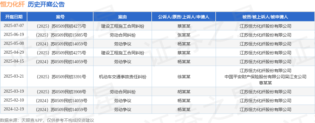 本站消息,根据天眼查APP显示,近日公布了一则江苏恒力化纤股份有限公司作为被告/被上诉人的开庭公告,详细内容如下: